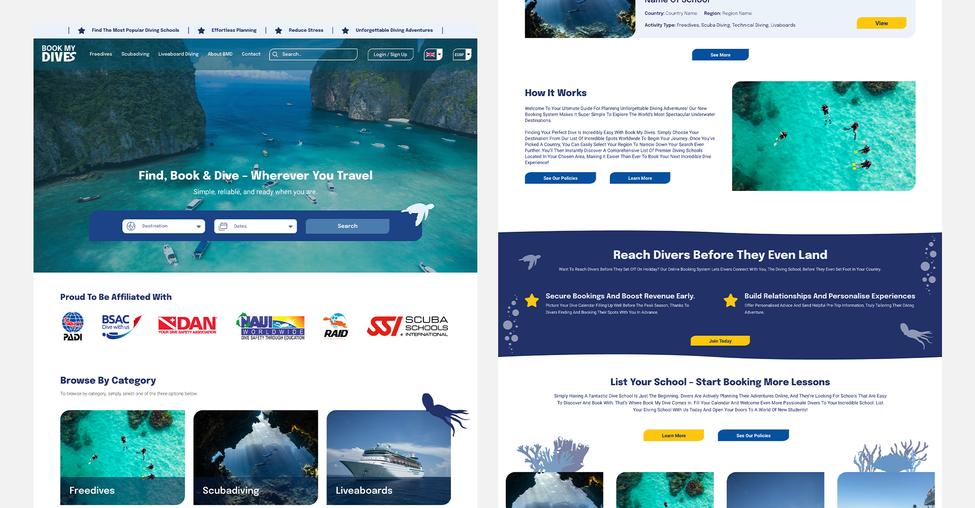The client needed a website that was both visually engaging and easy to use, providing a smooth experience for different user types. They required a clear system for categorising diving schools based on the types of dives they offer, as well as a way for users to search and filter diving experiences by country and travel date.