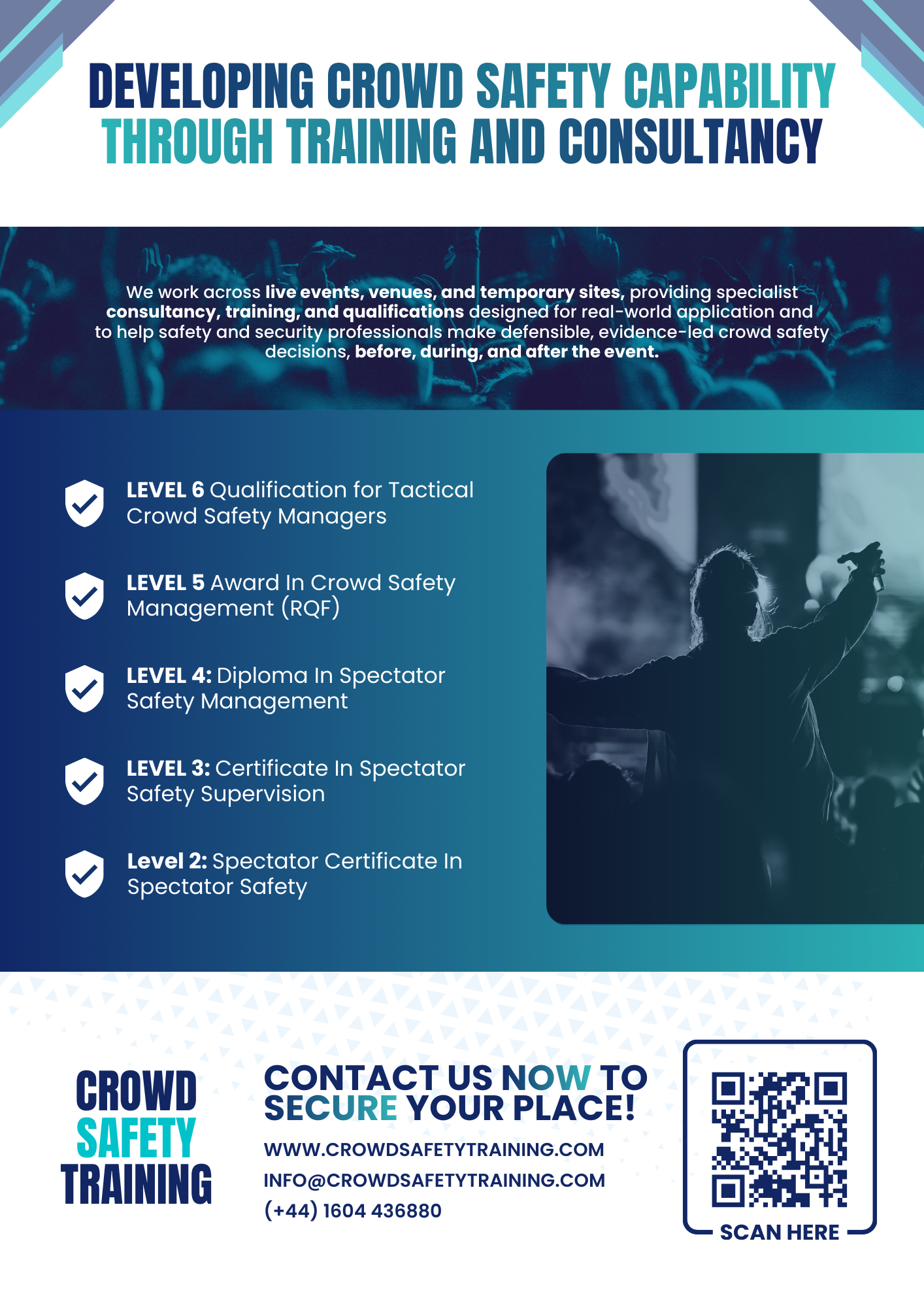 This advertisement was designed for publication in The Crowd Magazine, with the aim of strengthening Crowd Safety Training’s visibility within a specialist industry audience. The design focuses on clear communication and structured content, using a strong headline to establish authority and immediately convey the organisation’s core offering. A clean layout guides the viewer through key training levels, presenting information in a logical and accessible format that supports quick understanding.