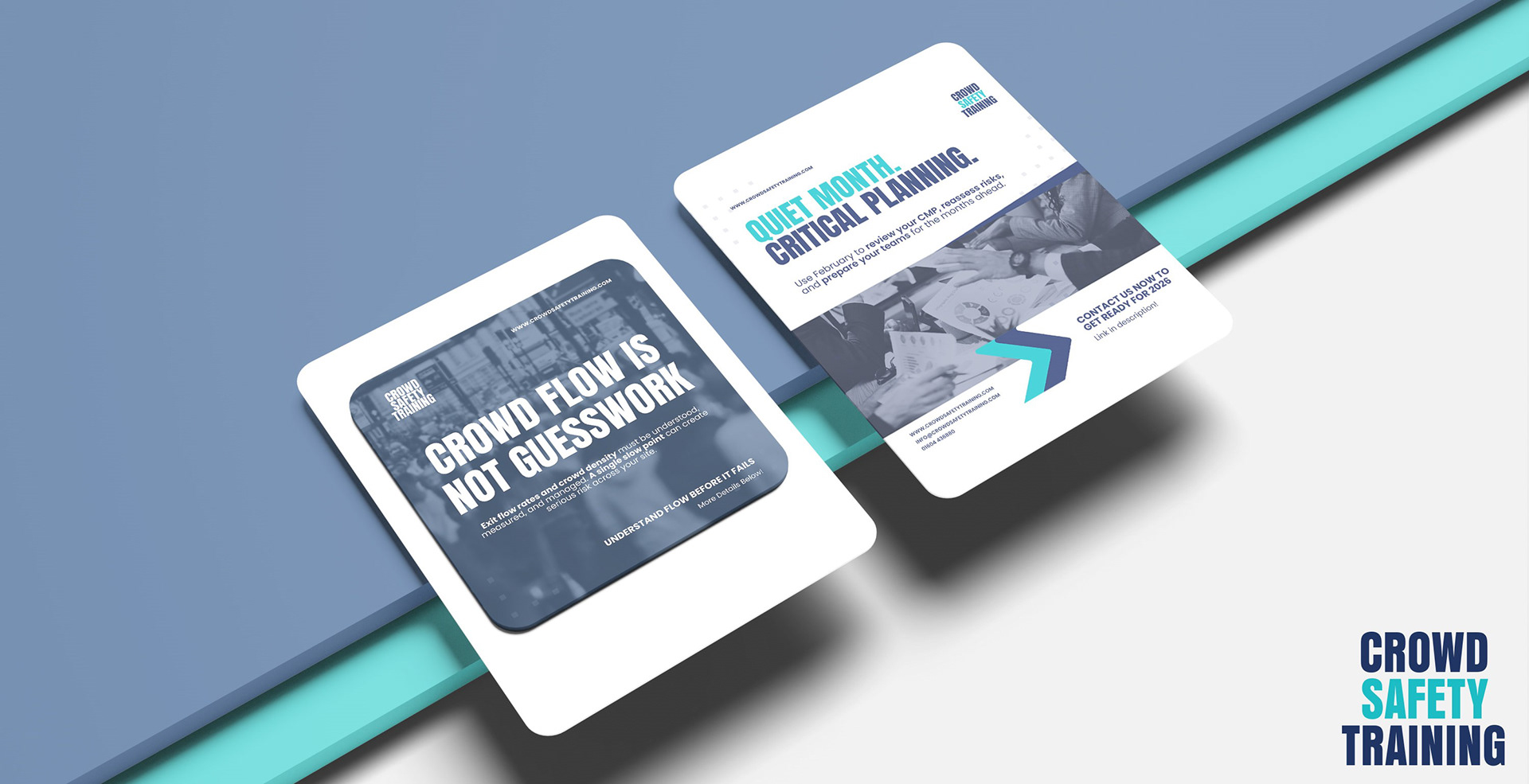 Crowd Safety Training operates within the event safety and crowd management sector, delivering industry-focused training to professionals working in high-capacity environments. I was brought on to develop a set of visual communications aimed at strengthening their brand presence and improving how their services are presented to a specialist audience.