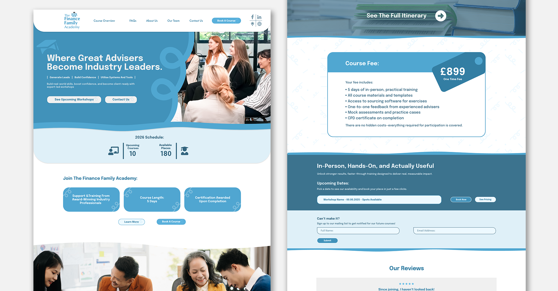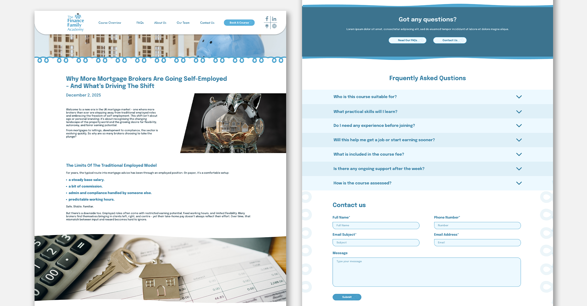 The Finance Family Academy aeste o companie cu sediul în Kidderminster, UK și este specializată în furnizarea de cursuri de formare profesională pentru brokerii ipotecari acreditați care doresc să își aprofundeze cunoștințele și să dobândească experiență practică înainte de a avansa în carieră. Inițial, am fost contactați de compania-mamă, The Finance Family, o firmă de consultanță ipotecară, pentru a crea un site web dedicat cursurilor viitoare ale Academiei.